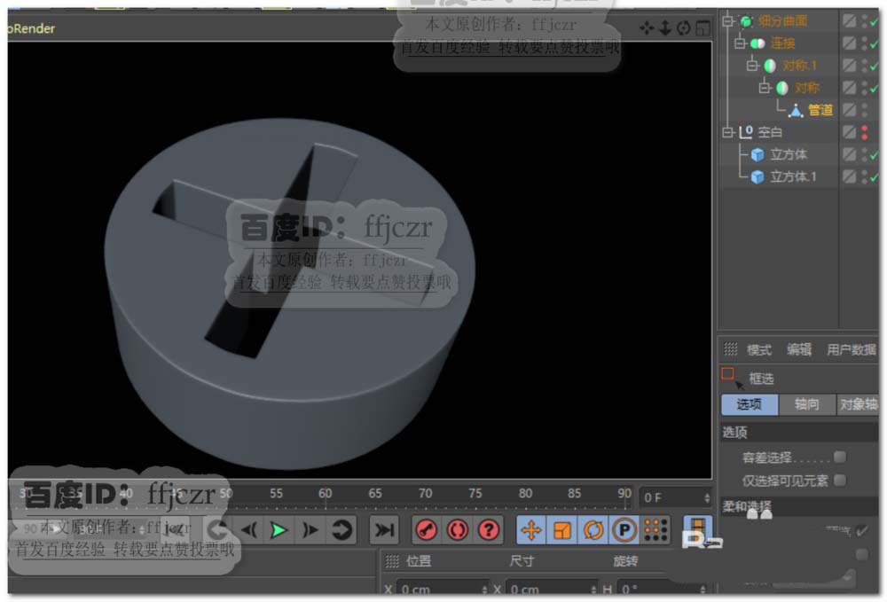 C4D中想要?jiǎng)?chuàng)建一個(gè)零件模型,如圖所示,在圓柱的頂面開十字形通孔,該怎么創(chuàng)建呢?下面我們就來看看詳細(xì)的教程。