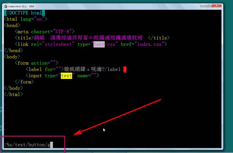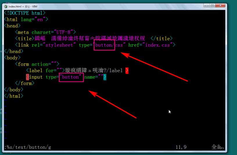 5、完整的語(yǔ)法是:%s/text/button/g,點(diǎn)擊回車。這里的text是舊內(nèi)容,button是新內(nèi)容,g表示全局的意思。