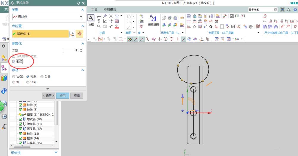 2、從命令查找器查找“藝術(shù)樣條”命令并啟動,在彈出的藝術(shù)樣條命令對話框中勾選“封閉”選項(xiàng)。繪制樣條曲線并調(diào)整大小。