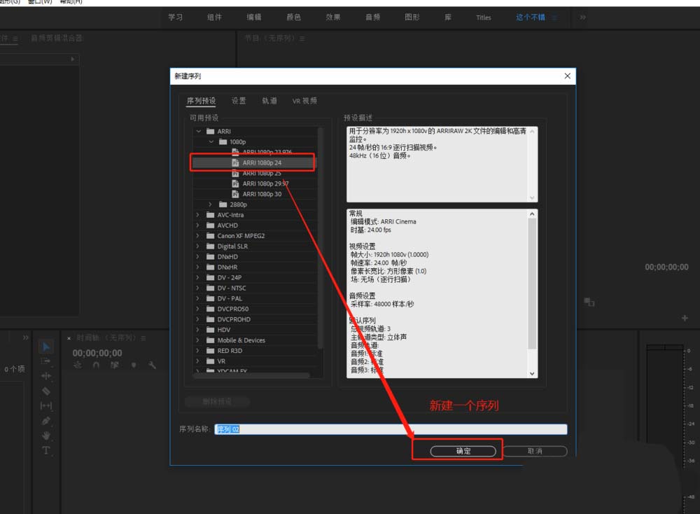 1、在一個空白PR項目中,點擊新建按鈕,來新建一個序列,這里我直接選擇了一個默認(rèn)序列,點擊創(chuàng)建。