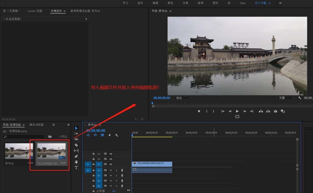 2、然后在選擇視頻文件媒體導(dǎo)入到PR項目中,將導(dǎo)入的視頻文件拖到序列的時間軸對應(yīng)的視頻軌道上。
