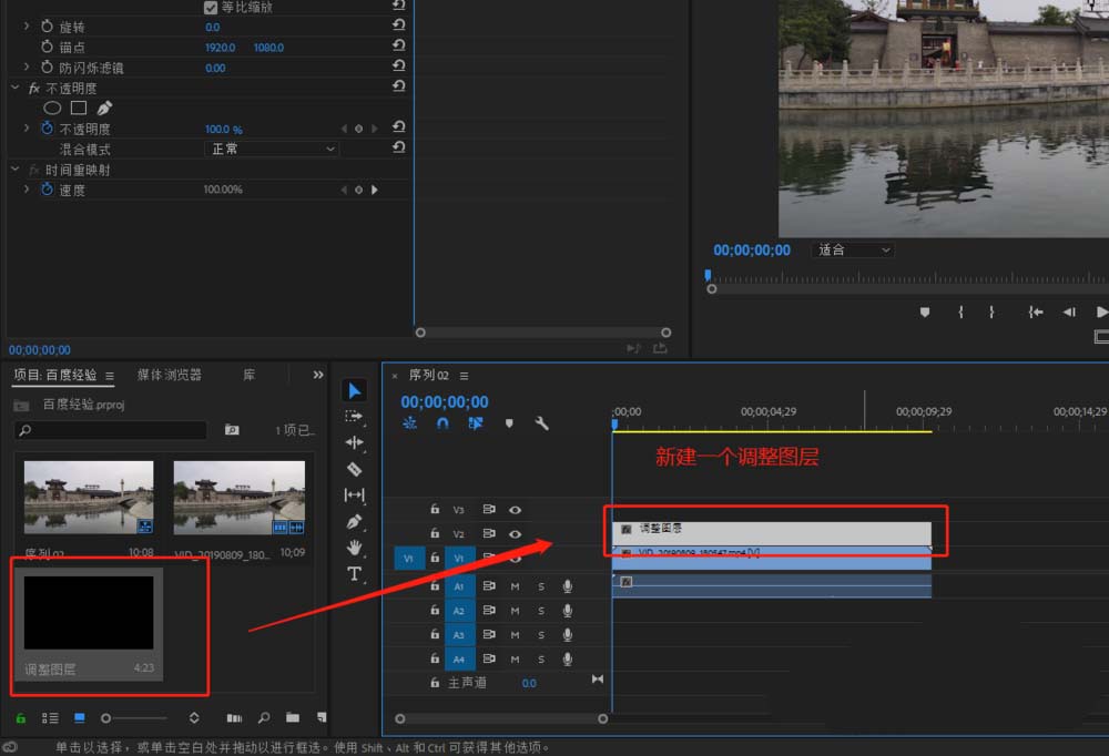 3、在來新建一個調(diào)整圖層出來,并且將這個新建的調(diào)整圖層移到序列的兩一個視頻軌道,位于視頻文件的上方。