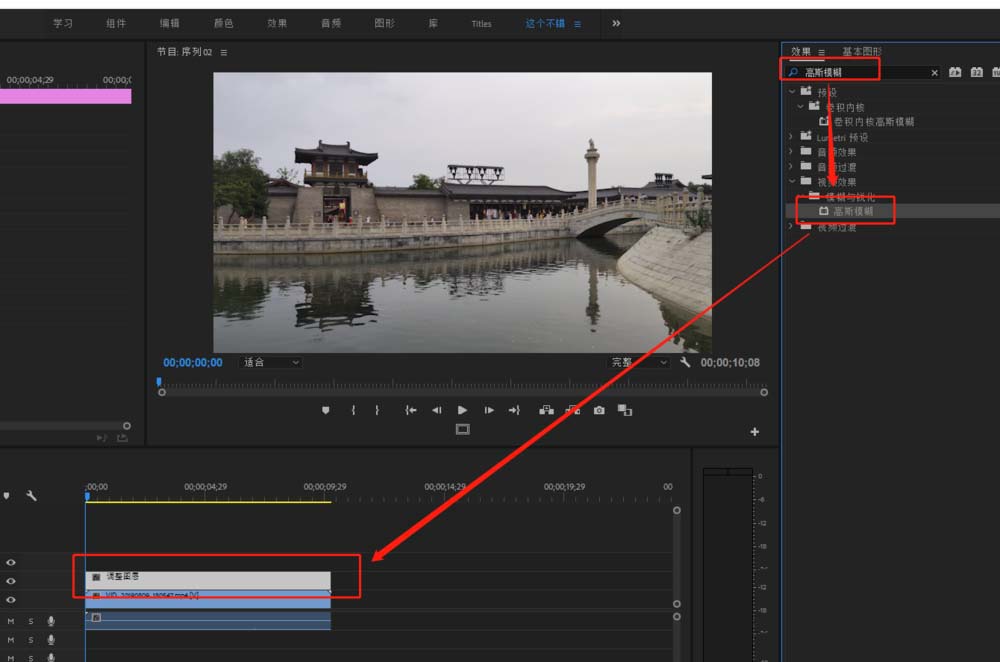 4、在效果窗口中進行搜索“高斯模糊”得到這個高斯模糊的視頻效果,將這個高斯模糊視頻效果拖到調(diào)整圖層上。