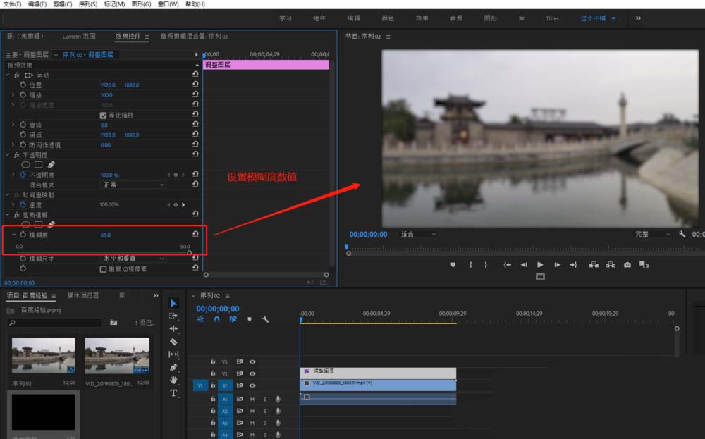5、打開調(diào)整圖層的效果控件,可以看到添加的高斯模糊的視頻效果,設(shè)置高斯模糊的模糊度數(shù)值就可以看到視頻畫面的模糊效果。