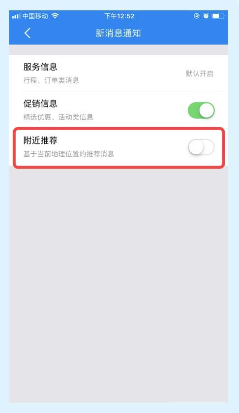 6、關閉附近推薦選項后,就可以是攜程旅行app不再基于我的地理位置向我們發(fā)出推薦消息了。關閉附近推薦,如下所示:
