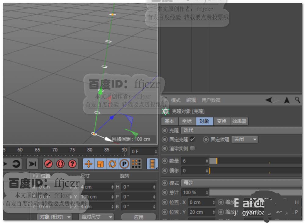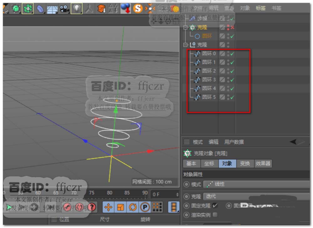 2、給圓環(huán)添加一個(gè)線性克隆,數(shù)量為6(后面更改為10個(gè)更好),位置為向Y軸克隆20的距離。