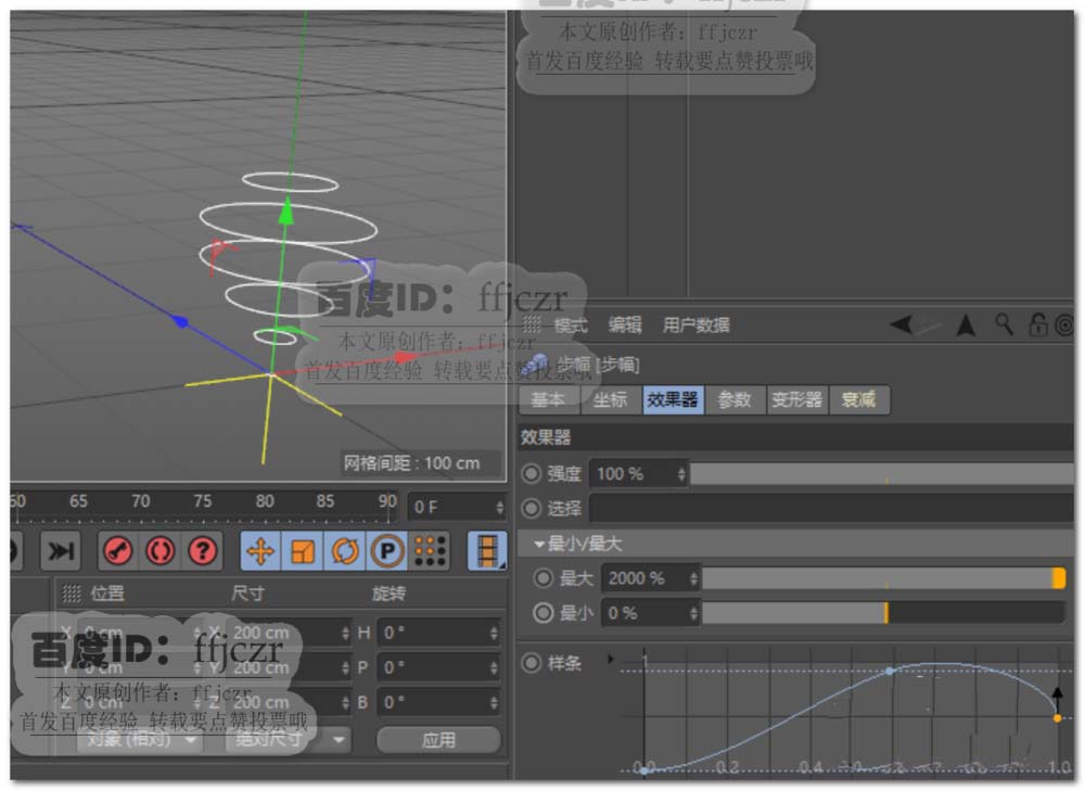 3、給克隆添加一個(gè)步輻效果器,調(diào)整效果器的樣條曲線形狀來控制克隆組的形狀;通過調(diào)整最大值與最小值,控制克隆組上端圓環(huán)與下端圓環(huán)的大小。