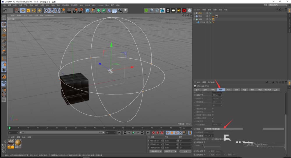 7、新建一個燈光,放在合適位置,打開陰影--區(qū)域,在細節(jié)里找到衰減,選擇平方倒數(shù)(物理精度),調(diào)節(jié)衰減半徑至合適大小