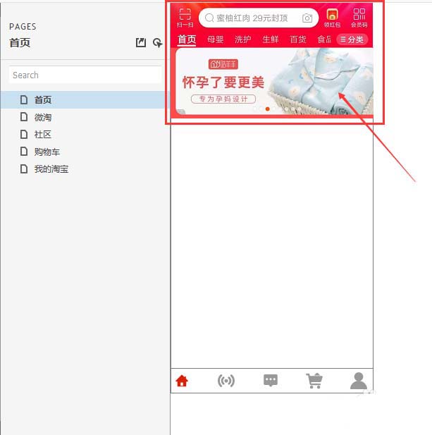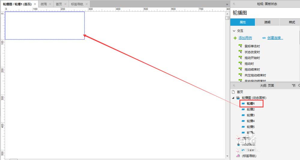 4、上一步創(chuàng)建好之后,在頁面右邊大綱下,有我們剛才創(chuàng)建的多態(tài)面板,點(diǎn)擊輪播圖1,在工作區(qū)域會(huì)打開輪播圖1:
