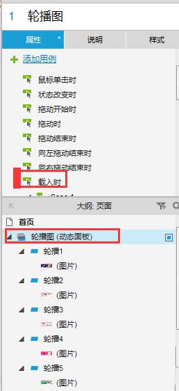 1、點(diǎn)擊大綱下面剛才創(chuàng)建的 面板,在屬性面板中點(diǎn)擊頁面加載時(shí):