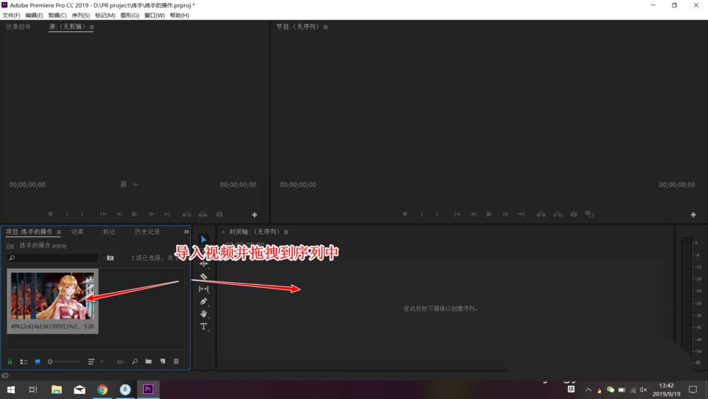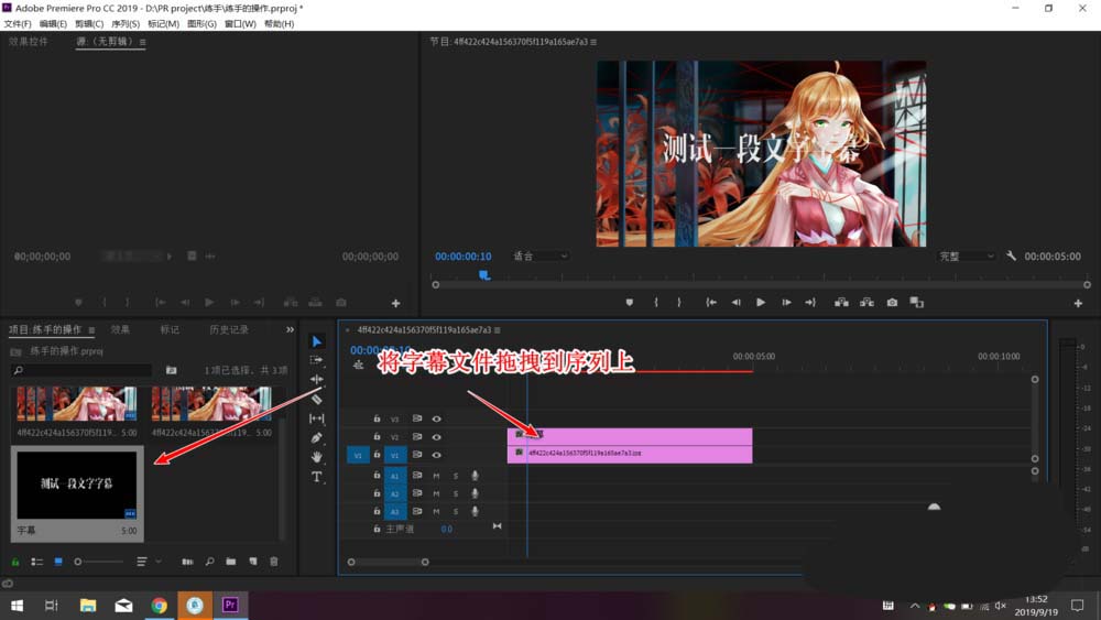 7、接下來(lái)我們直接關(guān)閉該界面即可。這個(gè)時(shí)候我們可以看到序列上并沒(méi)有顯示字幕,而在項(xiàng)目的管理器中有字幕文件,我們將其拖拽到序列上即可。