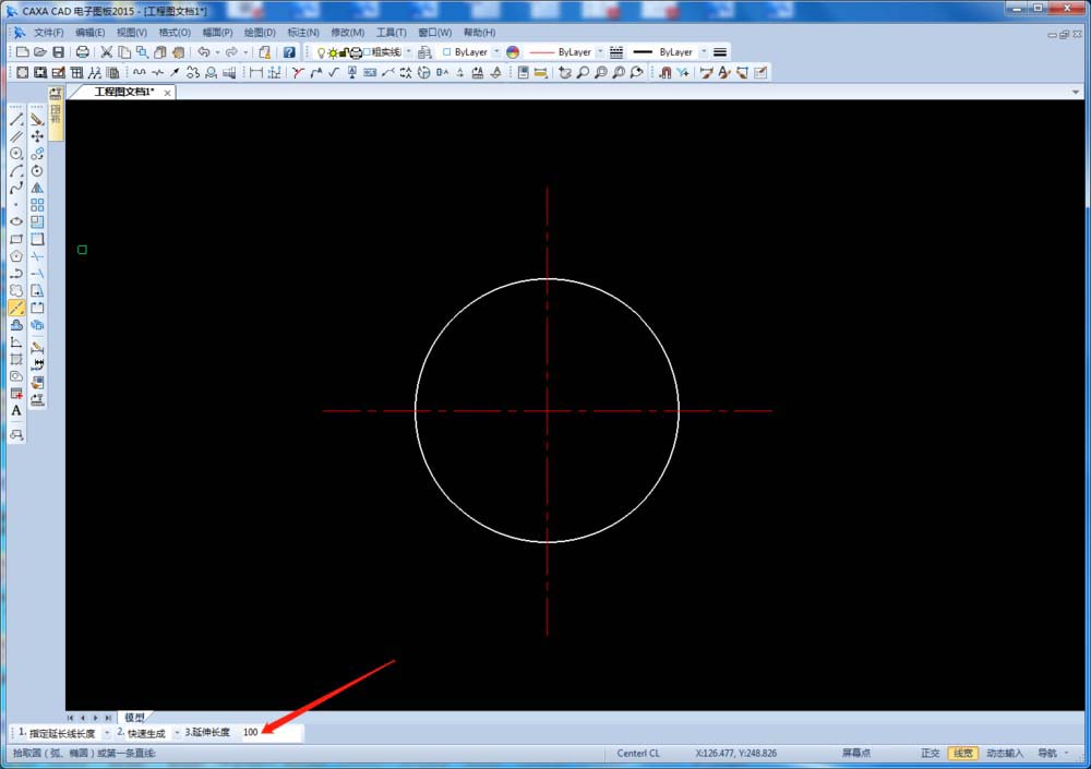 4、之后在狀態(tài)欄左下角就會出現(xiàn)所要繪制的中心線的參數(shù)了,在這里可以隨意修改中心線的延伸長度,直到自己滿意為止。