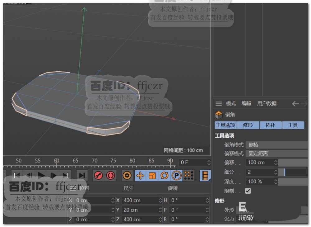 4、給調(diào)整后的多邊形添加合理的結(jié)構(gòu)線;選中多邊形的上表面輪廓邊,進(jìn)行倒棱角,偏移值為20,細(xì)分為1(倒角要勾選限制)。