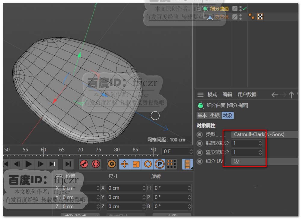 2、將立方體轉(zhuǎn)為可編輯對(duì)象用循環(huán)切刀給多邊形縱橫添加三組結(jié)構(gòu)線。選中多邊形的四條側(cè)邊進(jìn)行倒角,偏移值為100,細(xì)分為2.