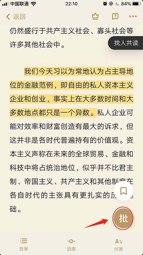 3、在閱讀頁面,輕觸底部空白位置之后,點(diǎn)擊彈出來的設(shè)置上方的“批”;