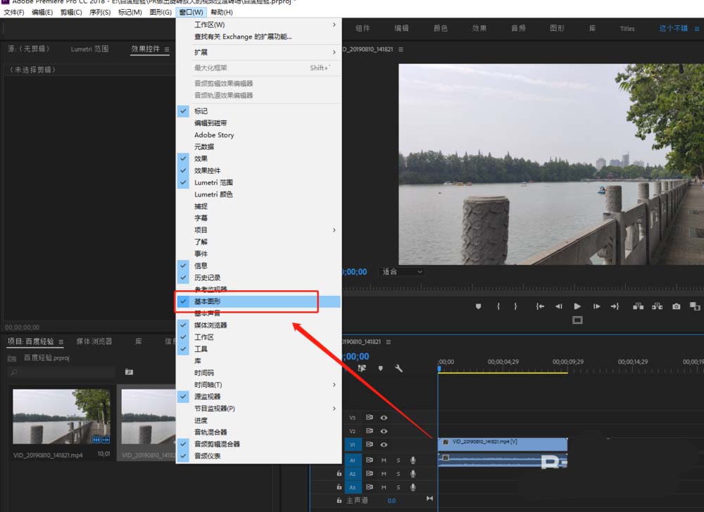 1、打開一個(gè)PR項(xiàng)目或者自行創(chuàng)建一個(gè)PR項(xiàng)目,然后在PR窗口菜單欄中勾選顯示“基本圖形”窗口面板。
