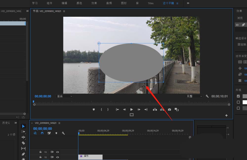 3、選擇了橢圓之后,拖動(dòng)鼠標(biāo)左鍵在視頻畫面上畫出一個(gè)橢圓圖形出來(lái),調(diào)整橢圓的大小與位置。