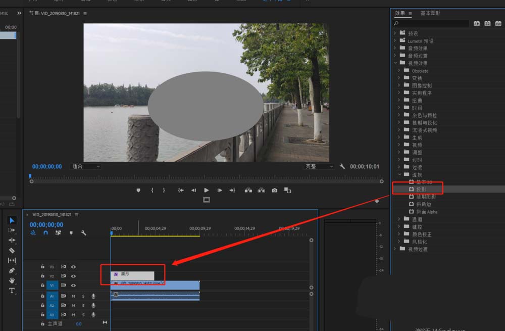 4、切換到效果窗口,找到視頻效果中的投影效果,將這個(gè)投影效果拖動(dòng)橢圓圖形媒體對(duì)象上面。