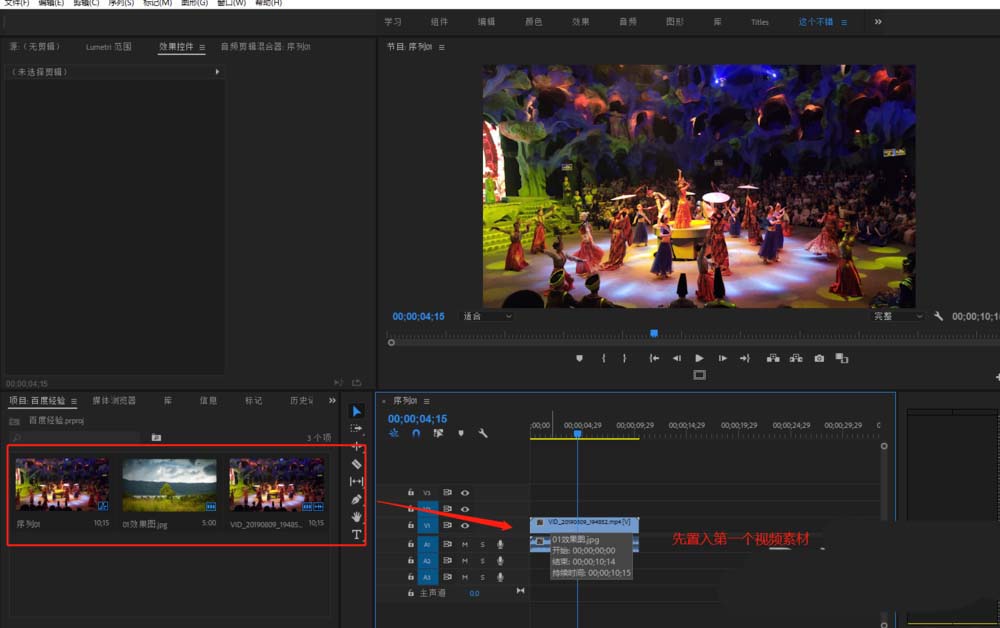 1、在PR項(xiàng)目中創(chuàng)建剪輯序列,然后導(dǎo)入兩個(gè)素材,一個(gè)動(dòng)態(tài)視頻素材,一個(gè)靜態(tài)圖片素材,先將視頻素材置于序列的時(shí)間軸軌道1.