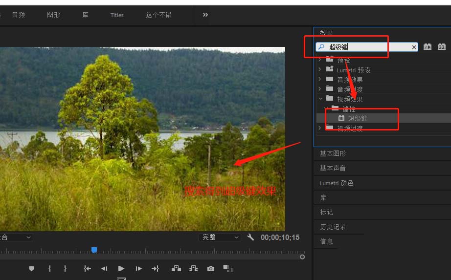 3、顯示效果窗口,在效果窗口中搜索關(guān)鍵字“超級(jí)鍵”,進(jìn)行搜索得到超級(jí)鍵的視頻效果。