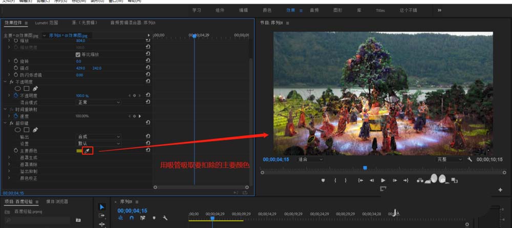 5、選中視頻軌道2靜態(tài)圖片素材,打開效果控件找到超級(jí)鍵,在超級(jí)鍵的主要顏色上選擇吸管,用吸管在靜態(tài)素材上的主要顏色上進(jìn)行吸取點(diǎn)擊。