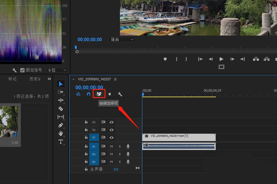 2、應(yīng)用在時(shí)間軸視頻軌道上的視頻文件一般默認(rèn)視頻與音頻是綁定的,我們選中視頻,點(diǎn)擊“鏈接選擇項(xiàng)”按鈕將視頻與音頻進(jìn)行分離,方便我們下面添加效果。