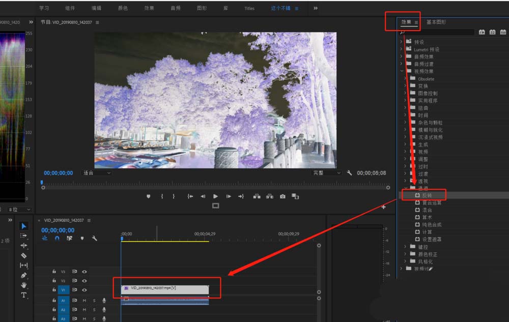 3、打開效果窗口,在效果窗口中進(jìn)行查找找到“反轉(zhuǎn)”效果,將反轉(zhuǎn)效果應(yīng)用于視頻媒體對象。