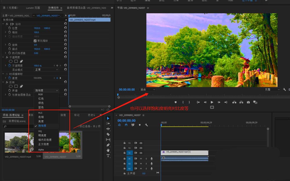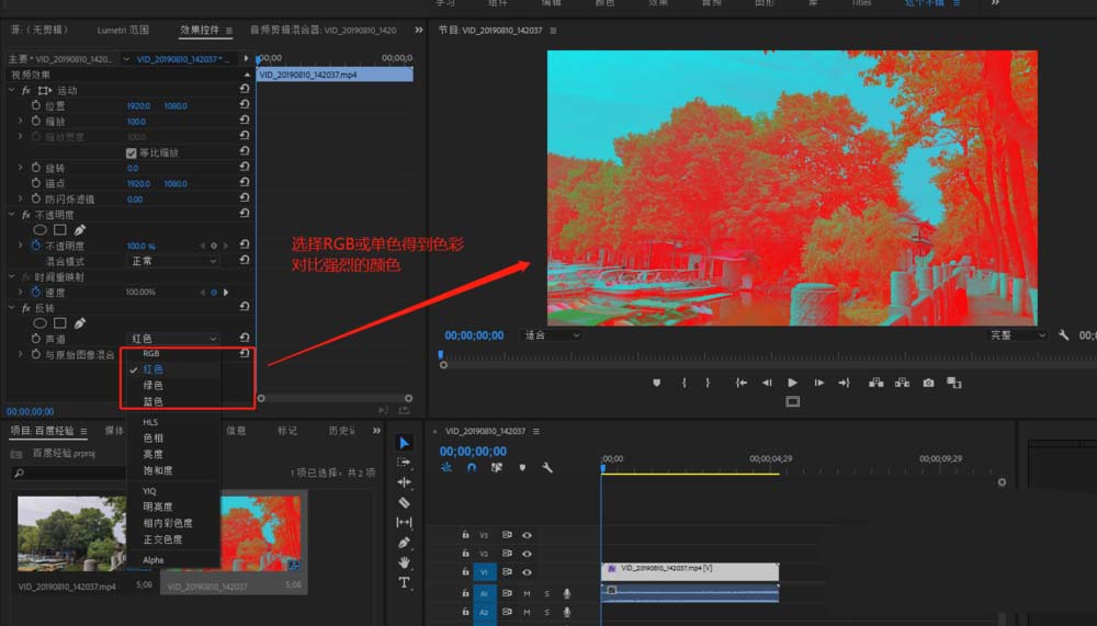 4、在效果控件的反轉(zhuǎn)效果設(shè)置中,先可以嘗試選擇聲道為RGB,或者是紅色、綠色與藍(lán)色,這樣可以得到顏色反差對比強(qiáng)烈的視頻畫面顏色。