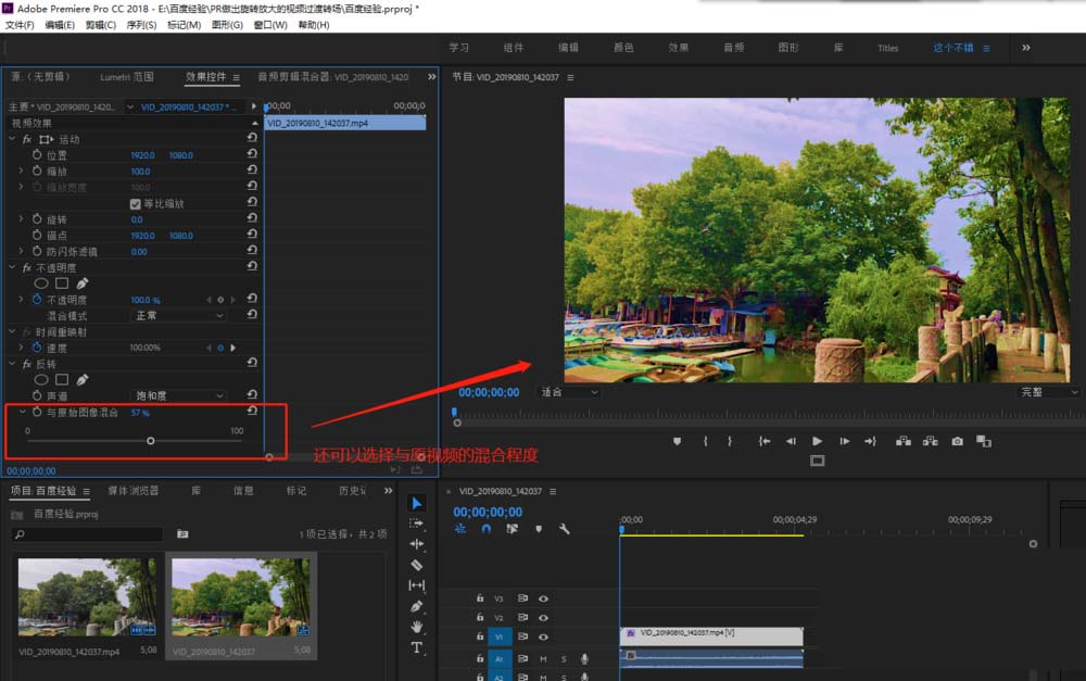 6、最后在反轉(zhuǎn)效果的效果控件設(shè)置中還有一個“與原始圖像混合”,設(shè)置混合程度,選擇其效果與原圖像進(jìn)行混合。