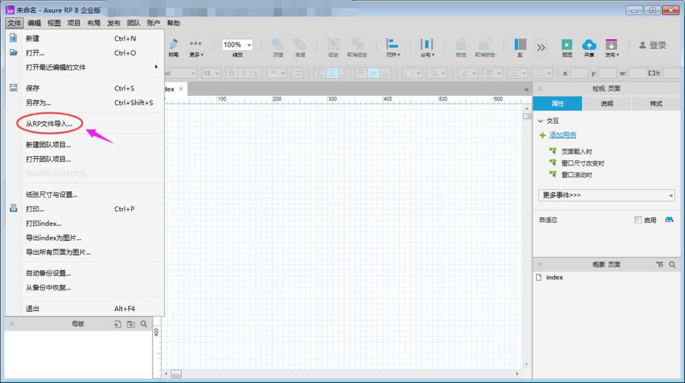 1、打開Axure,找到【文件】菜單下的【從RP文件導入】,如圖