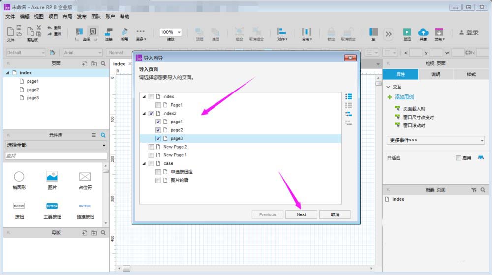 3、進入【導入頁面】選擇,選擇要導入的頁面,然后選擇Next進入下一步,如圖
