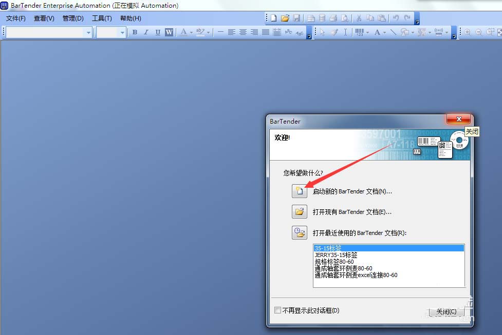 1、打開(kāi)BarTender軟件,并在歡迎對(duì)話框上點(diǎn)擊選擇“啟動(dòng)新的BarTender文檔”,如果沒(méi)有歡迎對(duì)話框的話,可以點(diǎn)擊菜單欄的“文件--新建”,打開(kāi)“新建文檔向?qū)?/strong>”對(duì)話框。
