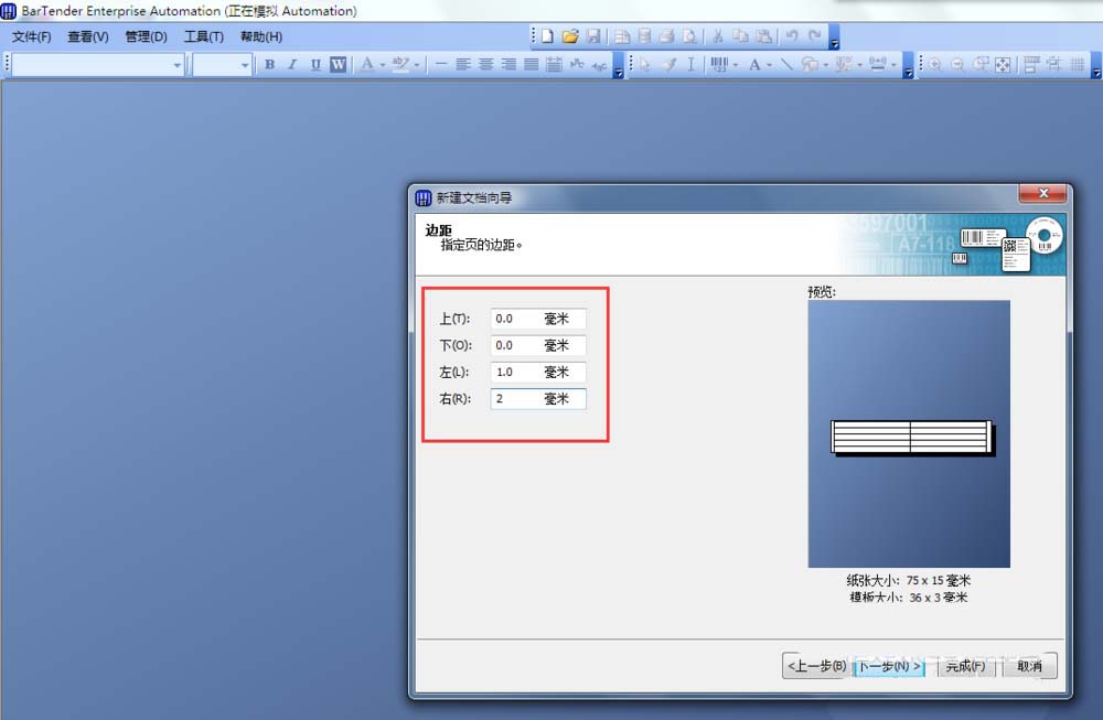 7、在“邊距”設(shè)置頁(yè)面中,我們將“上”和“下”都設(shè)置為0.0毫米,根據(jù)測(cè)量結(jié)果將“左”設(shè)置為1.0毫米,將“右”設(shè)置為2毫米,如圖。點(diǎn)擊下一步,進(jìn)入“行數(shù)和列數(shù)”設(shè)置頁(yè)面。