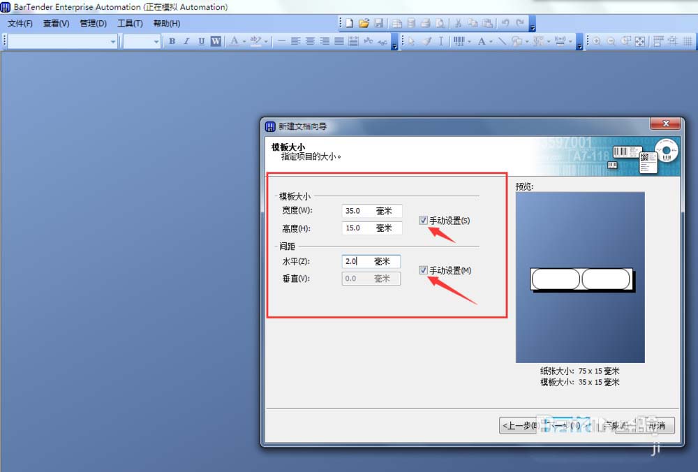 9、在“模版大小”設(shè)置頁(yè)面,勾選“模版大小”和“間距”右邊的兩個(gè)“手動(dòng)設(shè)置”選項(xiàng),并將寬度設(shè)置為35毫米,高度設(shè)置為15毫米,水平間距設(shè)置為2毫米。點(diǎn)擊下一步,進(jìn)入“打印順序”頁(yè)面。