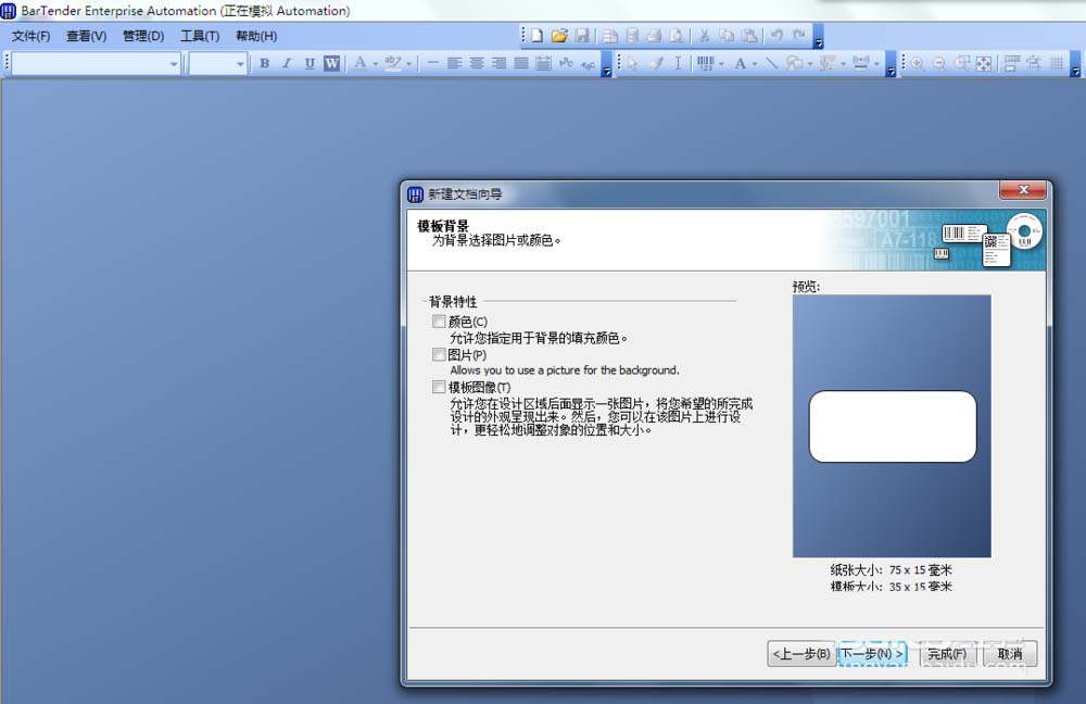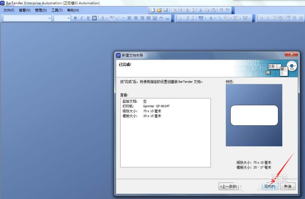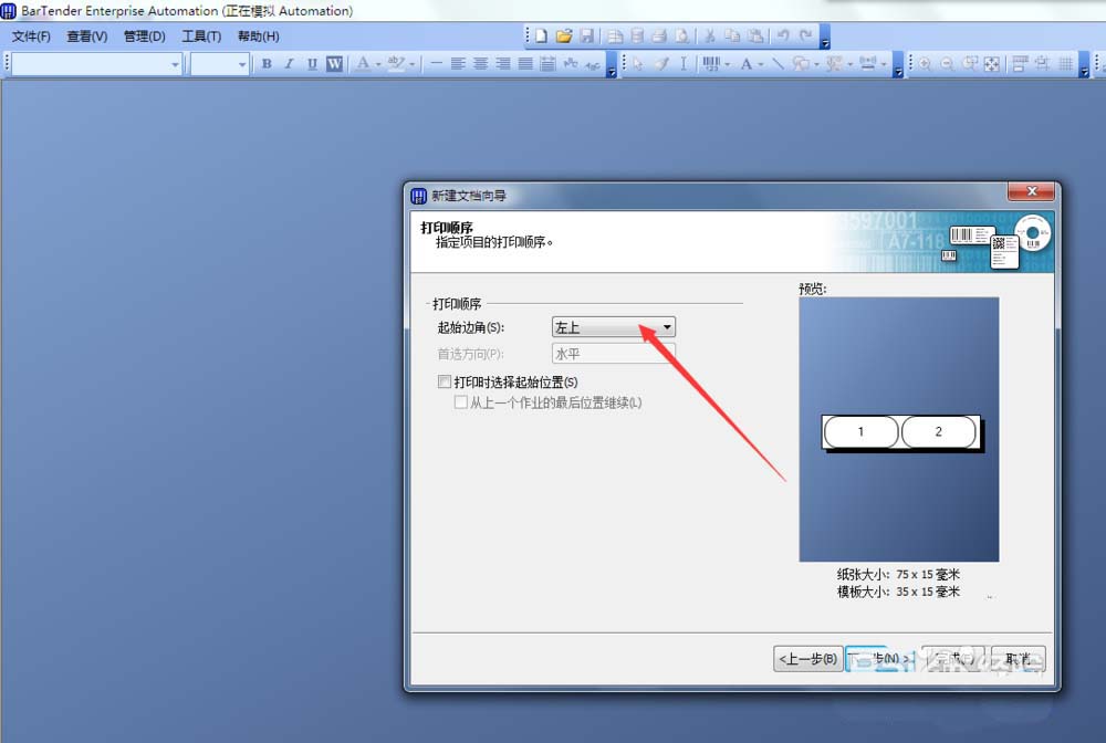 10、在“打印順序”頁面,根據(jù)實(shí)際的打印順序設(shè)置“起始邊角”,這里選擇“左上”。點(diǎn)擊下一步,進(jìn)入“模版背景”頁面,這里直接默認(rèn)就行,直接點(diǎn)擊下一步,進(jìn)入“已完成”頁面,點(diǎn)擊又下方的“完成”按鈕,至此我們已完成了大部分設(shè)置,但是現(xiàn)在窗口顯示的標(biāo)簽圓角太大了,我們需要再進(jìn)行調(diào)整一下,不過不調(diào)整也直接可以用了。