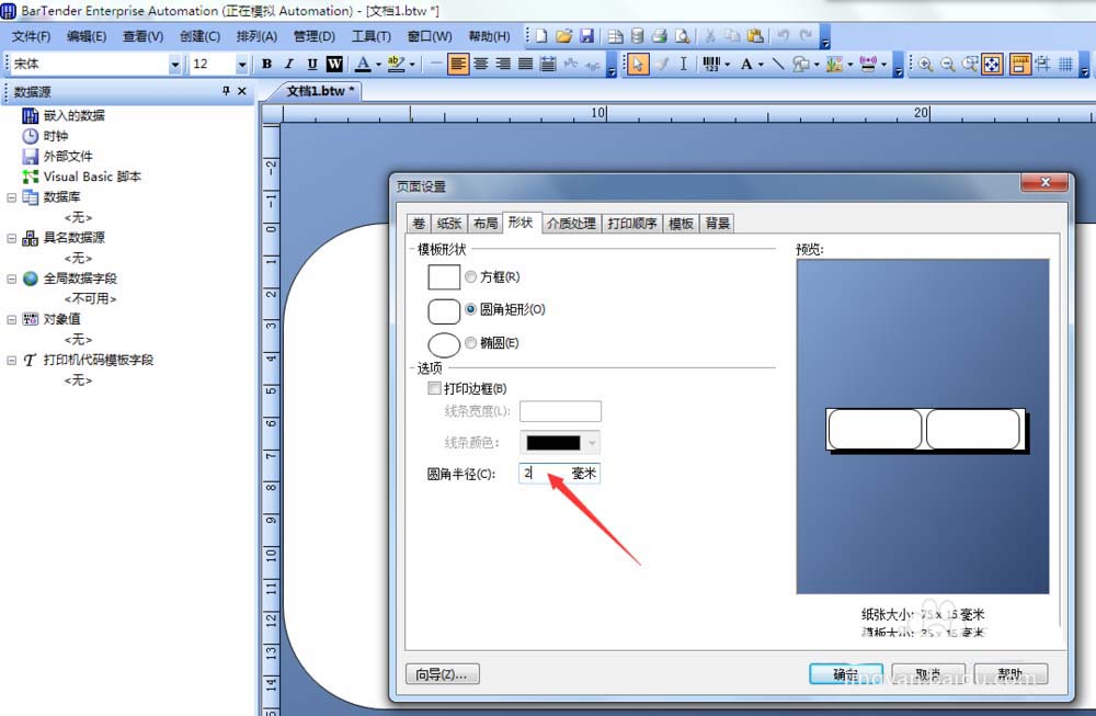 12、在“頁面設(shè)置”對話框中,選擇“形狀”選項(xiàng)卡,將“圓角半徑”設(shè)置為2毫米,點(diǎn)擊確定。