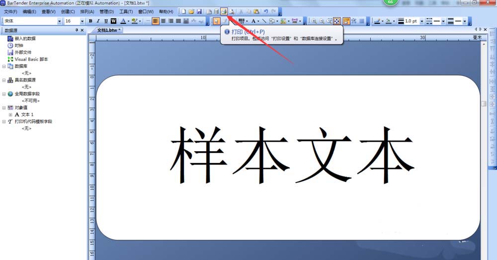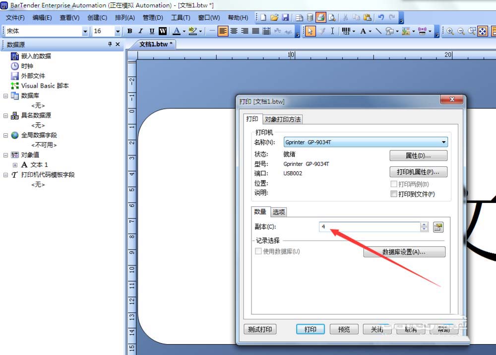 13、下面需要打印測試一下,看我們設(shè)置的有沒有問題,在工作區(qū)顯示的標(biāo)簽?zāi)0嫔咸砑右粋€“單行文本”,并調(diào)整字體大小,然后點(diǎn)擊上方的打印按鈕或點(diǎn)擊菜單欄的“文件--打印”,打開打印對話框。并在打印對話框中,將打印數(shù)量改為4。點(diǎn)擊“打印”按鈕,打印機(jī)會打出4張標(biāo)簽,這時我們發(fā)現(xiàn)打印位置有點(diǎn)靠左和靠下,需要進(jìn)行修改。