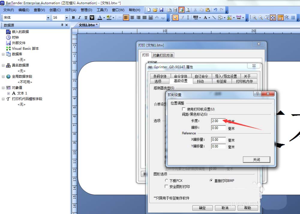 14、點(diǎn)擊打印按鈕或者點(diǎn)擊菜單欄的“文件--打印”,打開打印對話框,點(diǎn)擊“屬性”按鈕,進(jìn)入打印機(jī)屬性設(shè)置對話框,將下方的“非打印區(qū)域”“左”的值設(shè)置為2,這表示標(biāo)簽的最左邊2毫米為非打印區(qū)域。然后點(diǎn)擊“高級設(shè)置”選項(xiàng)卡,再點(diǎn)擊右下方的“其他”按鈕。打開“即刻設(shè)置”對話框,將其中的“間距/黑色標(biāo)記”下的長度設(shè)置為2毫米。點(diǎn)擊“關(guān)閉”,點(diǎn)擊“確定”,點(diǎn)擊“打印”。
