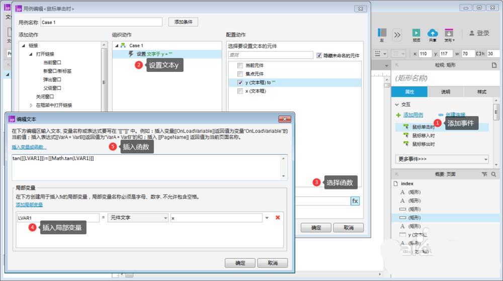 3、設(shè)置主要按鈕tan(x)的【鼠標(biāo)單擊時】事件:設(shè)置文本y的值為【tan([[LVAR1]])=[[Math.tan(LVAR1)]]】,其中LVAR1為局部變量,取值x文本框;