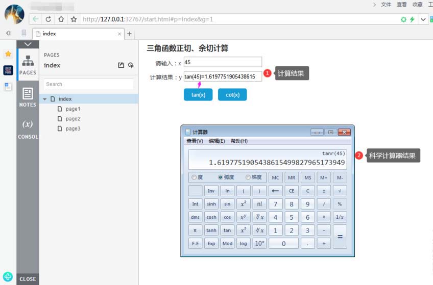 5、完成設(shè)置,預(yù)覽結(jié)果,計(jì)算tan(45)的結(jié)果與科學(xué)計(jì)算器結(jié)果對比。如圖