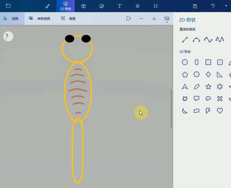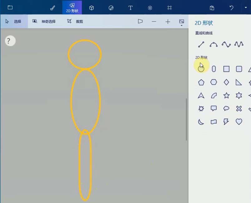1、打開畫圖3D程序,選擇菜單上的2D形狀,單擊圓形工具,畫一個長的橢圓形作為蜻蜓的身體上半部,接著畫一個小點的圓,放在橢圓的上方,作為蜻蜓的頭,再畫一個細(xì)長的橢圓,放在長橢圓的下方作為身體的下半部。