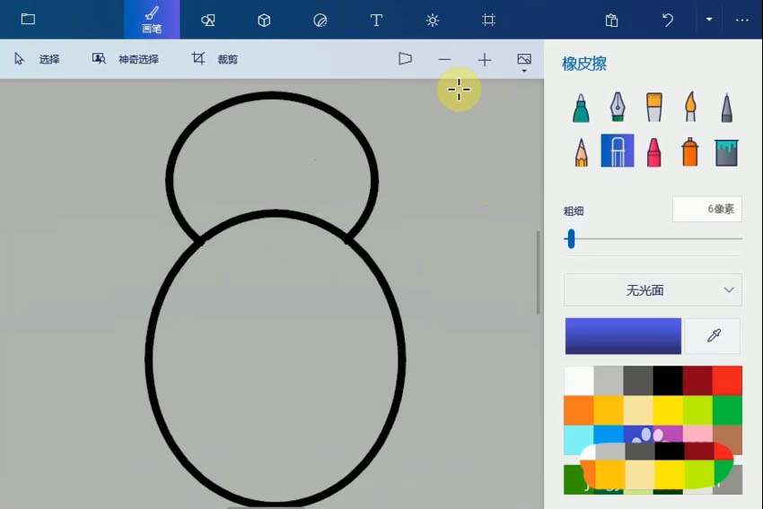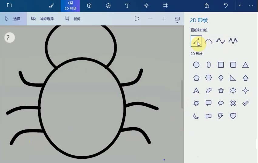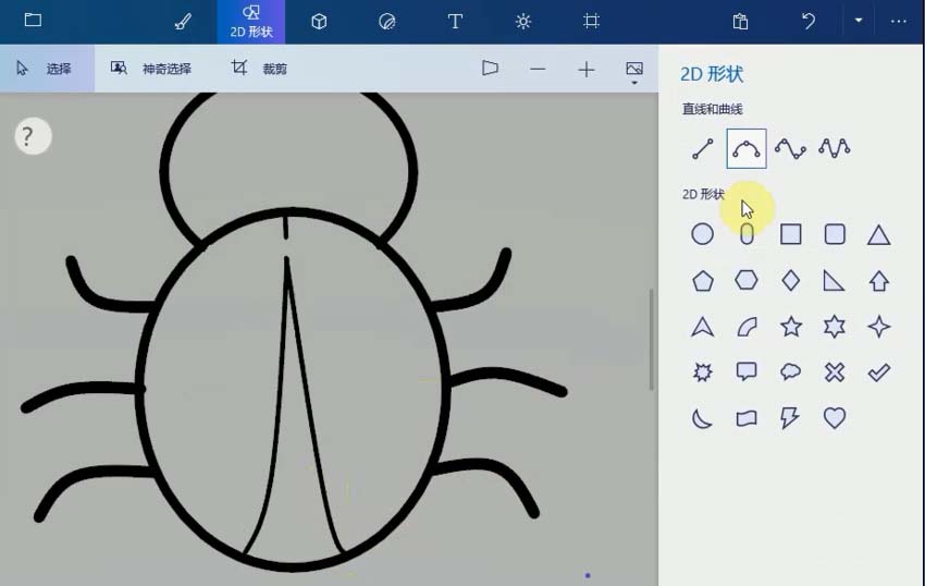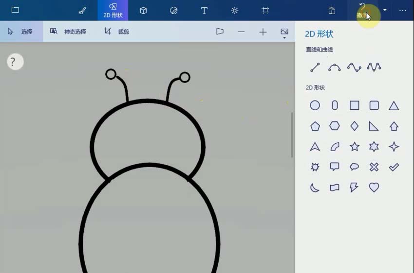 1、打開畫圖3D程序,選擇菜單上的2D形狀,單擊圓形工具,畫一個圓形作為七星瓢蟲的頭,再畫一個大的橢圓,放在頭的下面,作為身體,擦掉多余的線條。
