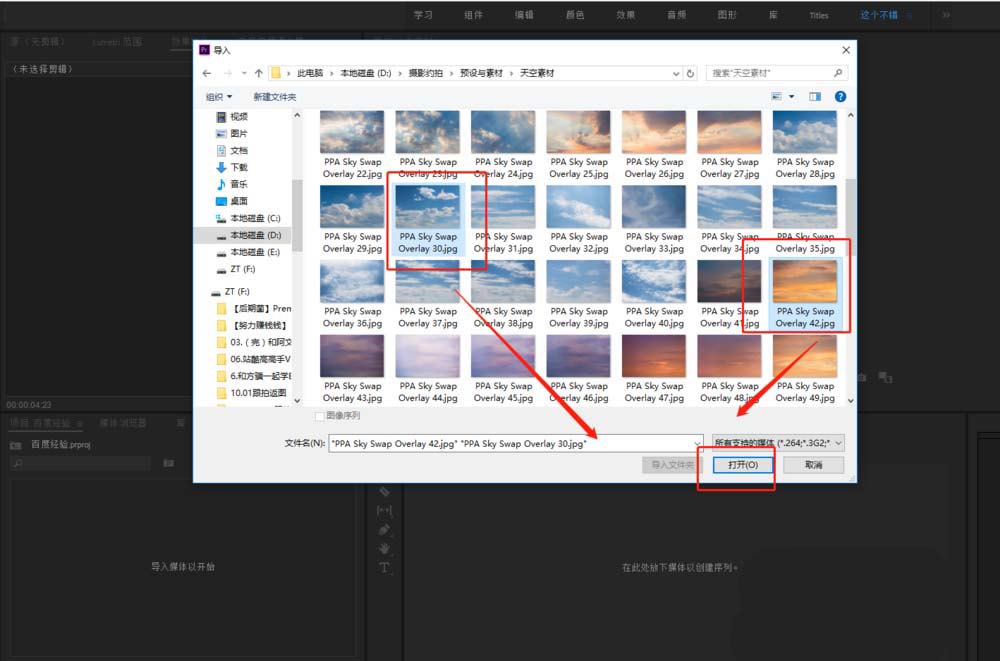 2、按Ctrl+I這個快捷鍵執(zhí)行導(dǎo)入,在彈出的導(dǎo)入對話窗口中選擇兩個媒體素材導(dǎo)入到PR。