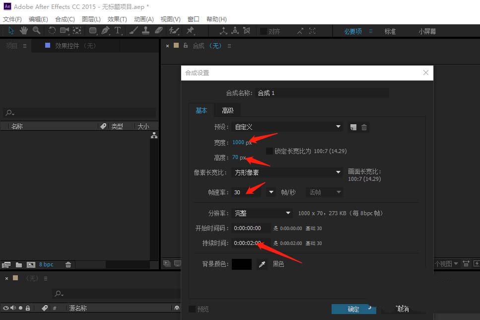 1、打開AE軟件,按CTRL+N新建一個合成,設(shè)置好長度和寬度和時間長度,再點擊確定按鈕。