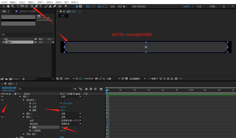 2、選擇圓角矩形工具,再新建的舞臺畫出一個圓角矩形,調(diào)整角的圓度,去掉描邊路徑的眼睛,填充好進度條底顏色,然后按CTRL+HOME居中圖形在舞臺中央。