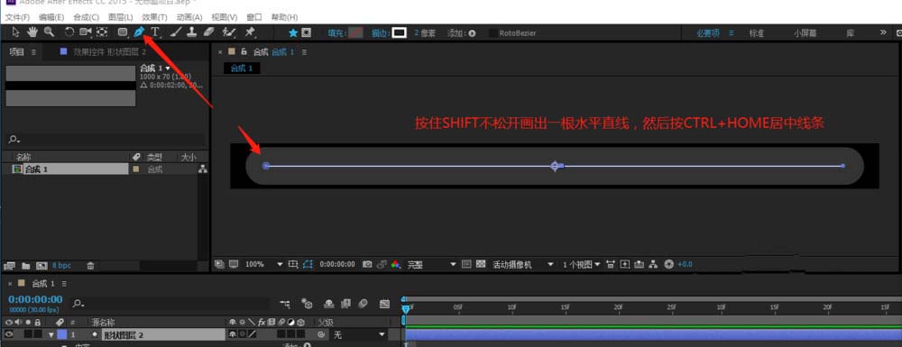 3、選擇鋼筆工具,按住SHIFT鍵并用鼠標(biāo)畫出一條水平直線,調(diào)整好線的長度,然后按CTRL+HOME居中線條。