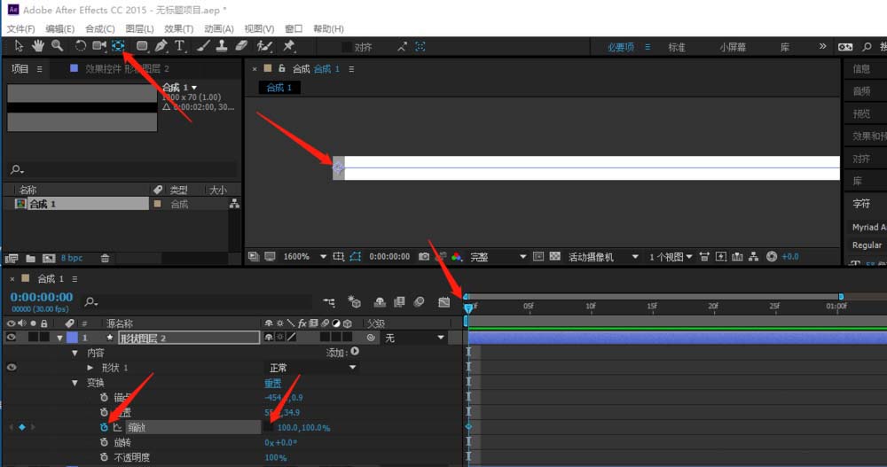 4、選擇錨點工具,把線條的中心點調(diào)到線條的左邊線端,在第一幀設(shè)置縮放關(guān)鍵幀并去掉框中的鏈條。再到縮放里設(shè)置線條長度為0,再到最后一幀設(shè)置線條長度為100。