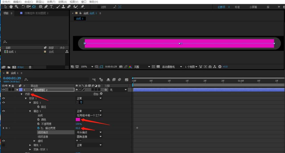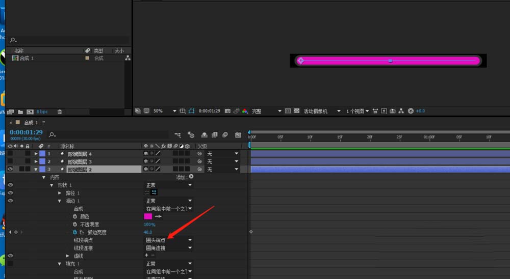 5、點開內(nèi)容項,設(shè)置好線條的寬度和顏色。最后線條兩端設(shè)置它的圓點,這時候按空格鍵就可以看見它的動畫效果了。這時候可以導(dǎo)出圖片序列了。按CTRL+M彈出對話框,設(shè)置好文件存放路徑,設(shè)置好圖片格式,和透明通道,再點擊確定按鈕,再點擊渲染按鈕,最后得到圖片序列。