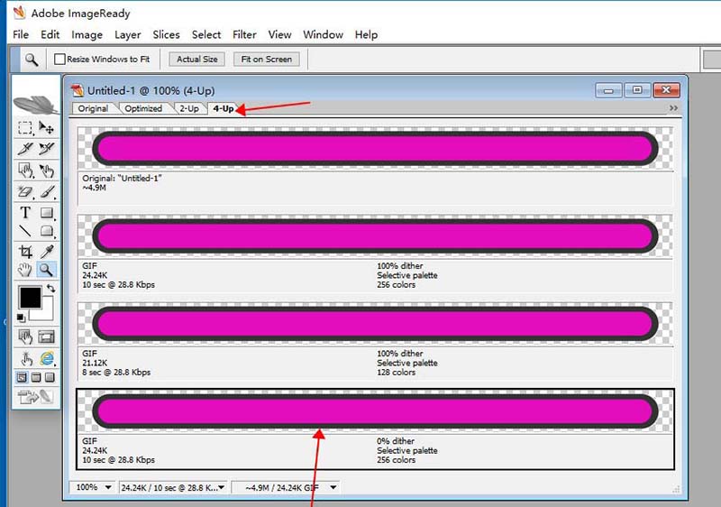 6、打開Adobe ImageReady CS2,導(dǎo)入剛才的圖片序列,選擇優(yōu)化好的第四聯(lián),再按CTRL+SHIFT+AIT+S輸出GIF格式,設(shè)置好保存路徑,導(dǎo)出后得到動態(tài)圖片。