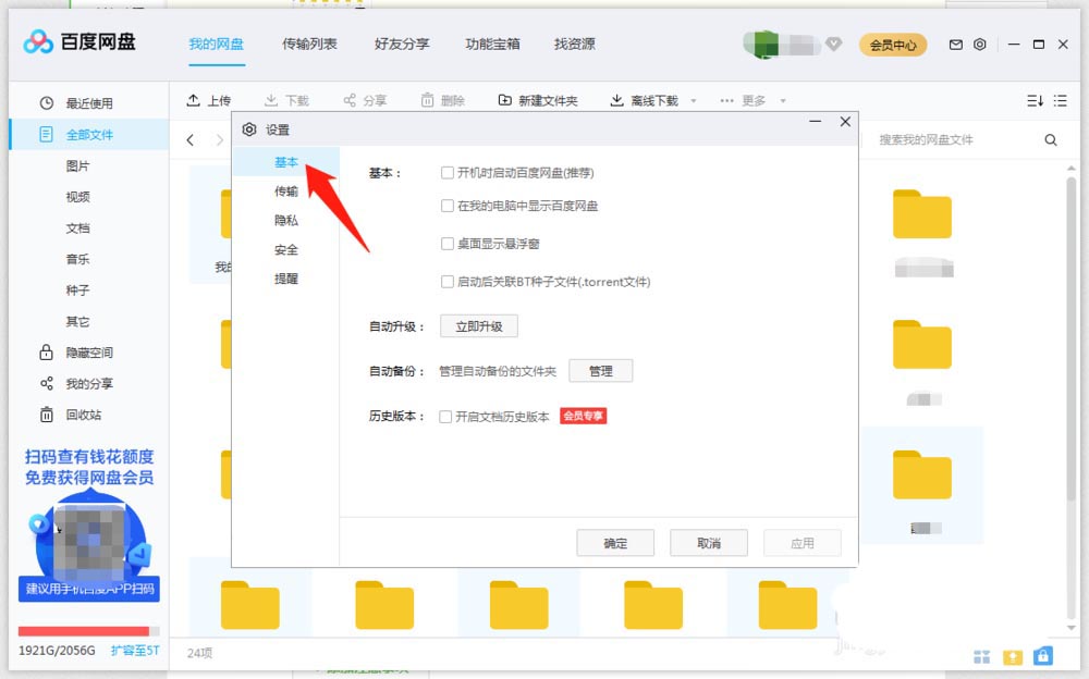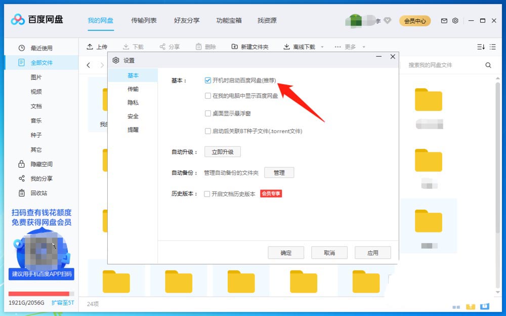 3、在基本選項下面,勾選“開機時啟動百度網(wǎng)盤”;